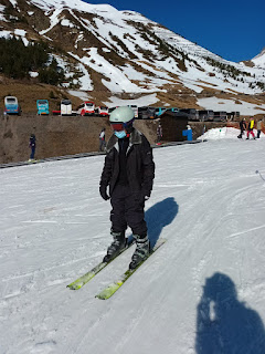 Hoy el día de esquí ha sido mejor que ayer, aunque la nieve estaba muy dura. Por fin hemos podido bajar pistas mas largas y hemos subido a cintas de niveles más altos. Algún compañero ha subido a la montaña arriba del todo. Hemos terminado muy cansados y me duelen mucho las piernas, aunque me dicen que eso es porque lo estoy haciendo bien.